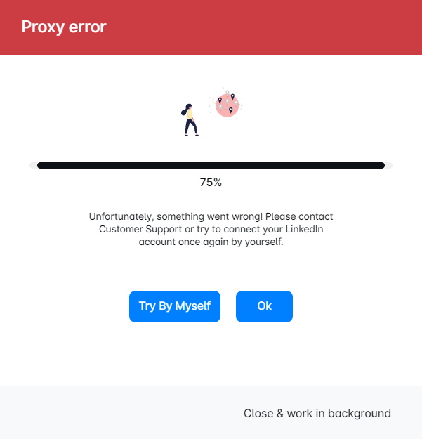 Haben Sie während der Onboarding-Phase ein Proxy-Problem? Manchmal sind Proxys für Ihr gewähltes Land nicht verfügbar oder es wurde der falsche ausgewählt. Klicken Sie einfach auf das Chat-Symbol, um unser Support-Team für schnelle Hilfe zu erreichen, und wir bringen Sie wieder auf den richtigen Weg. Genießen Sie Ihr Skylead-Erlebnis! 🚀