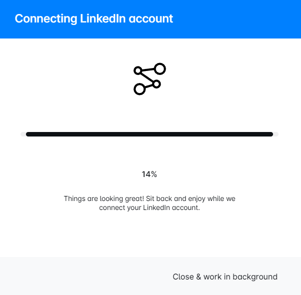 Dies bedeutet einfach, dass Ihr Konto dabei ist, sich mit LinkedIn zu verbinden. Normalerweise dauert dies nicht lange – etwa 5 Minuten oder so. Wenn es jedoch länger dauert, zögern Sie nicht, unser Support-Team um Hilfe zu bitten.