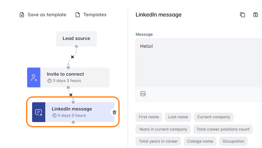 Sparen Sie Zeit mit der Kopier- und Einfügefunktion für Kampagnenschritte von Skylead! Duplizieren Sie ganz einfach Schritte wie Einladungen, Nachrichten oder E-Mails und passen Sie sie in der Reihenfolge an. Speichern Sie Ihre besten Schritte als Vorlagen für zukünftige Kampagnen, indem Sie auf die Vorlagenbibliothek zugreifen. Optimieren Sie Ihre Einrichtung und maximieren Sie die Effizienz! 🚀 Brauchen Sie Hilfe? Wir sind für Sie da.