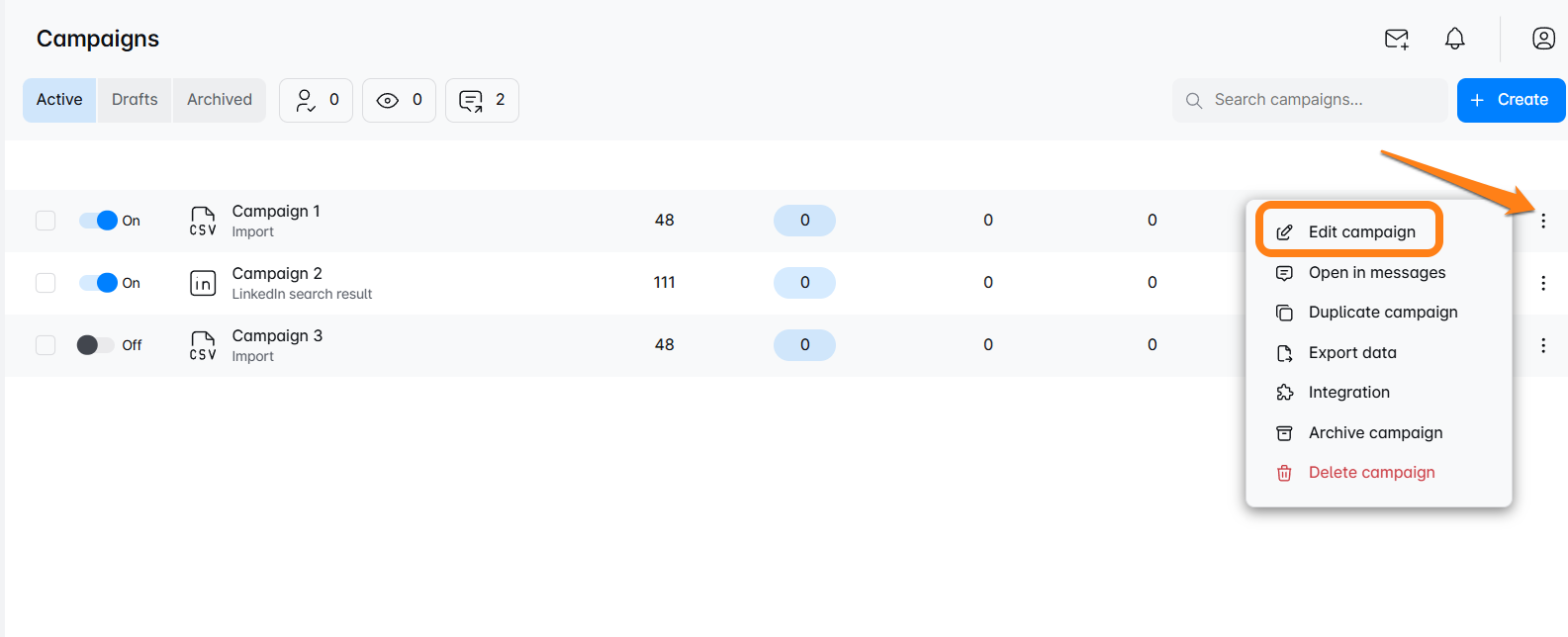 - Alternativ können Sie den Bearbeitungsmodus betreten, indem Sie eine Kampagne auswählen und dann die Registerkarte 'Kampagne bearbeiten' von der Leads-Seite aus wählen.