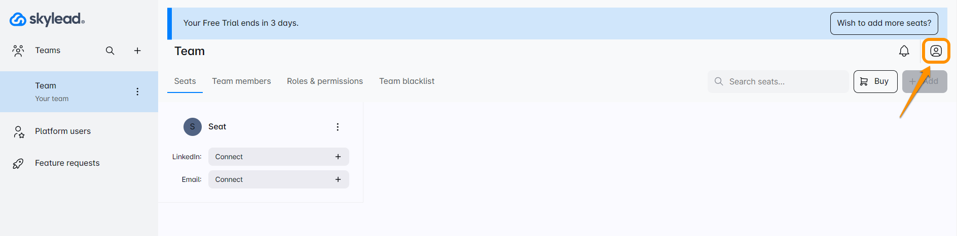 - Your API key is like a secret key to this integration treasure! You can find it easily in your Skylead account. Just click on this Account icon —this is where all the important stuff lives! ⚙️