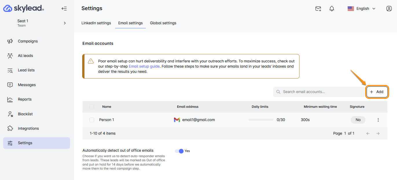 Now, head back to your Skylead account. Go to Settings ➡️ Email Settings