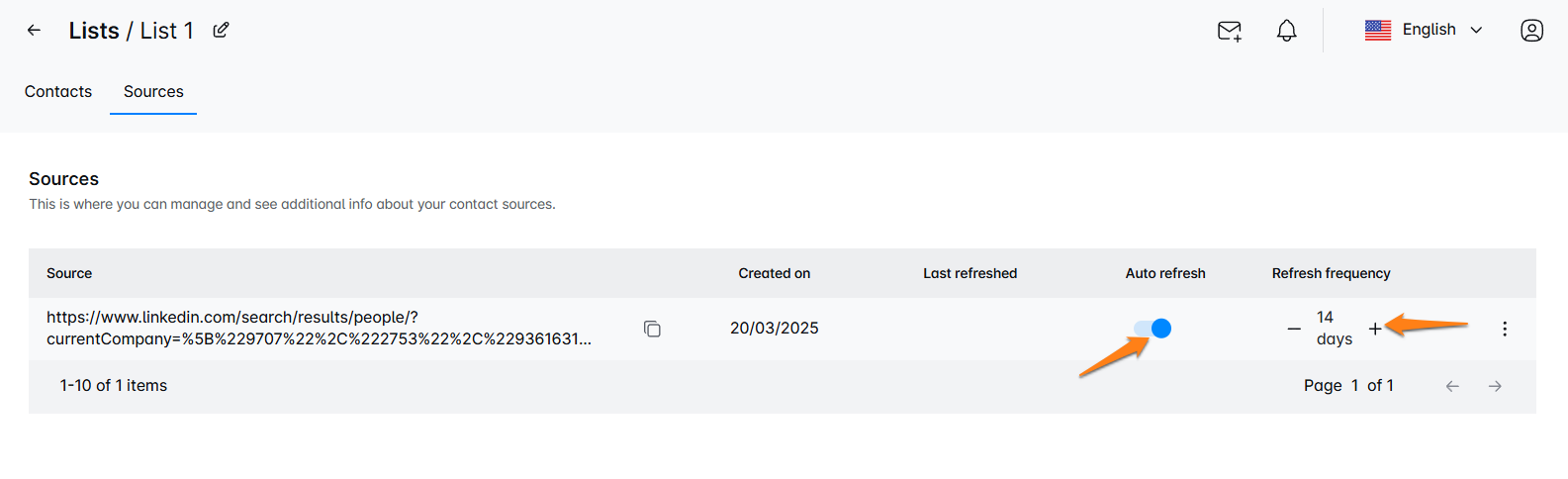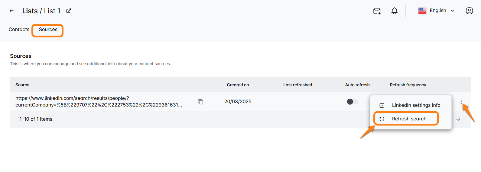 You can also enable the Auto-refresh option and choose your preferred refresh frequency. This way, new leads will be added automatically—no need to trigger the refresh manually. 🔄 Remember, Refresh search only works if you have used a search as a source.