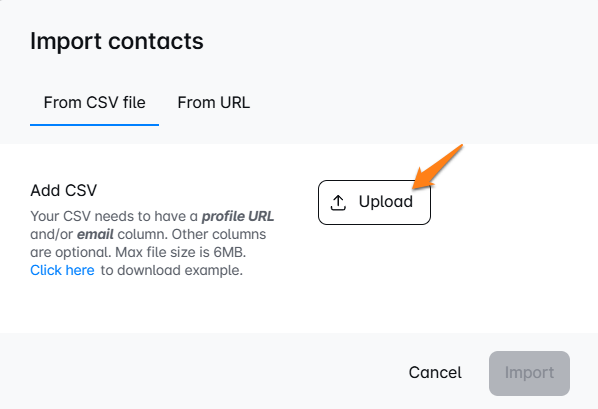 Now click on Upload and import the CSV file. To make sure your CSV file is correctly formatted, you can check our article. Once you added the file, click on Import.