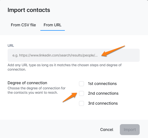- The other import option is to insert a Search URL: Just enter the URL, and you’re all set! 🌟 You can then pick your preferred connection degree. ✨