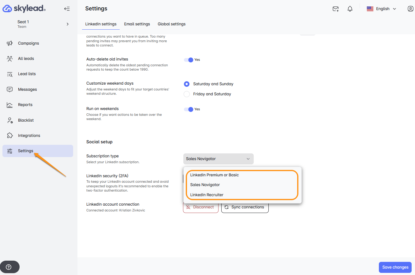 Choose Subscription Type such as LinkedIn Free/Premium, Sales Navigator, or Recruiter to match your current LinkedIn plan in order to keep your account updated. If your subscription changes, update it under the ‘Subscription Type’ in Settings to keep Skylead account seat running smoothly. 🚀🔗