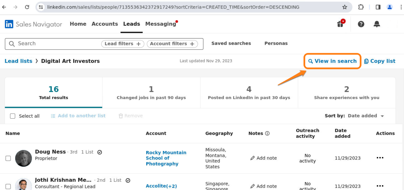 Start by adding all the people you want into a Leads list inside Sales Navigator. Once you’re ready, look for the View in search button and click it: