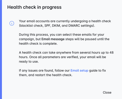 We’re introducing a brand-new Email Health Check feature to make sure your emails are always ready to run campaigns smoothly. Every connected email is automatically checked once a week, so you don’t have to worry about hidden issues affecting your results.