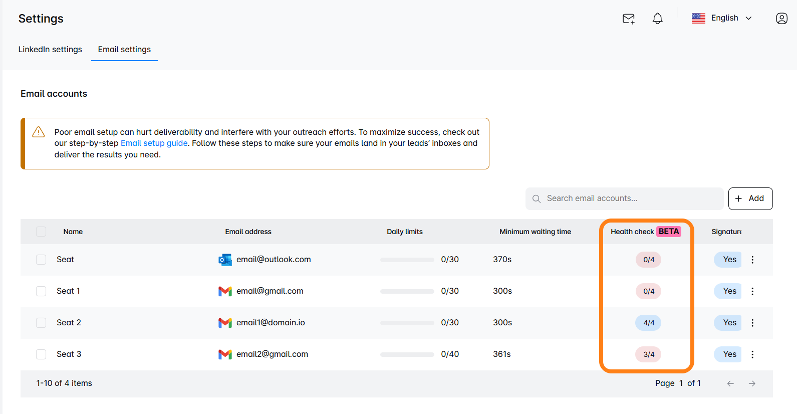 It shows a simple score like 4/4 when everything is healthy. If something’s off, you’ll see exactly how many checks passed and which ones need attention (3/4, 2/4, 1/4). If any required records fail, that email won’t be usable for campaigns until it’s fixed.