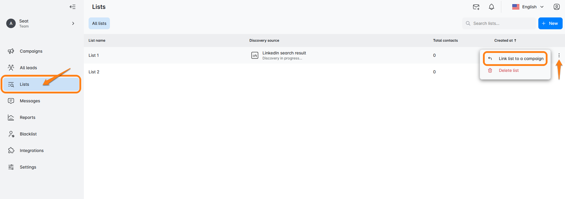 To link a list to a campaign, go to the Lists page and locate the list you want to use. Click the three-dot menu next to that list, then select Link list to a campaign from the available options.