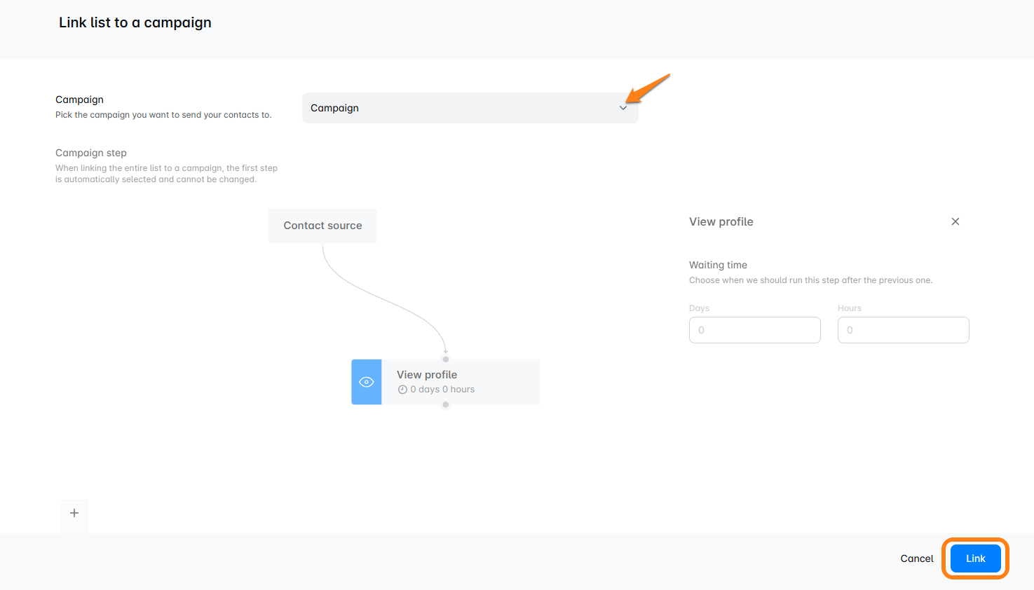 Now choose the campaign you want to link the list to, then click Link to finish adding the contacts to that campaign.