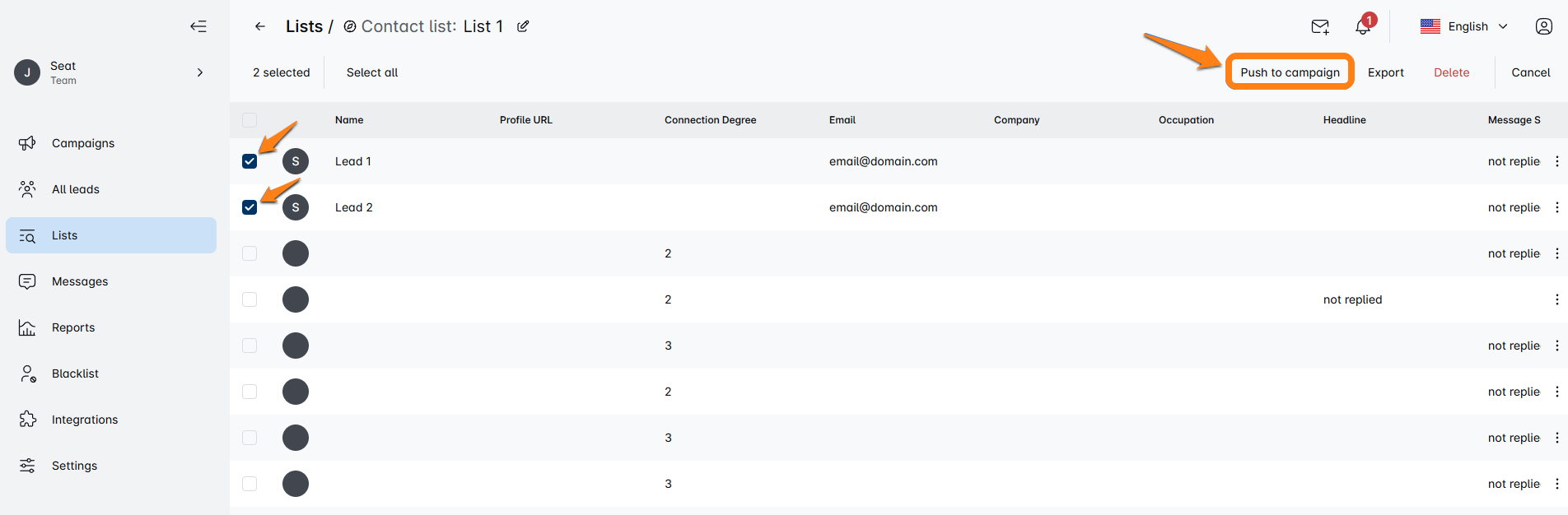Besides adding the entire list to the campaign, you can also push specific contacts to this step. To do that, first click on the list you from which you want to check the contacts and select each contact you want to push to the campaign: