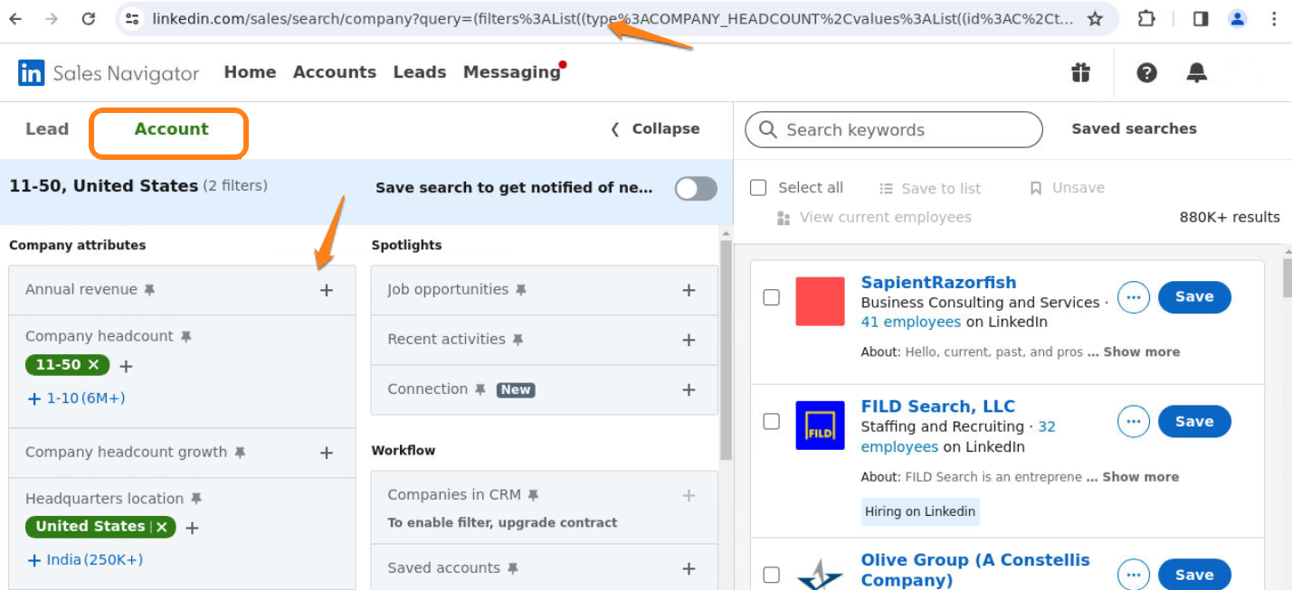 Start by navigating to the Accounts tab in your Sales Navigator, add the filters to find the companies you want to target and copy the URL of that search.
