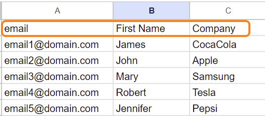 - Para enviar correos electrónicos usando un CSV como tu fuente de leads, necesitas una columna esencial: una columna llamada ‘email’ (en minúsculas).