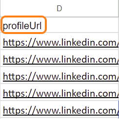 - Para una campaña combinada de email + LinkedIn, necesitarás dos columnas: una para las direcciones de correo electrónico y otra para las URLs de perfil de tus leads. Asegúrate de que la columna con URLs de perfil se llame exactamente profileUrl (con U en mayúscula).