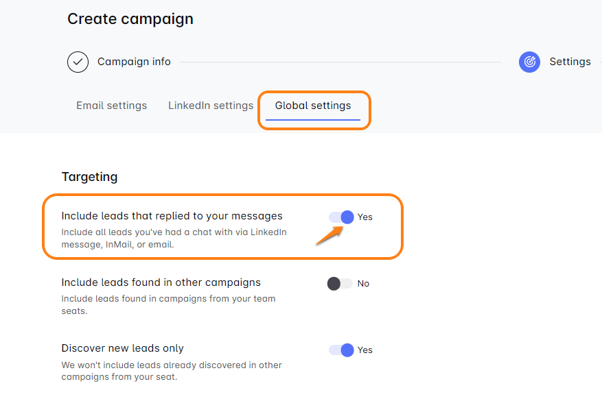 Si estás enviando correos a leads con los que ya has contactado, habilita la opción para continuar el hilo de conversación en Flujo de creación de campaña > Paso de Configuración > Configuración Global.