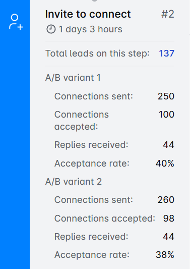Las pruebas A/B te ayudan a optimizar tu estrategia de alcance probando diferentes elementos como mensajes de LinkedIn, correos electrónicos o el tiempo entre pasos. Prueba un elemento a la vez para obtener información clara y revisa los resultados en la Página de Informes para ver qué variante funciona mejor. Analiza cuidadosamente para alinear los resultados con los objetivos de tu campaña.