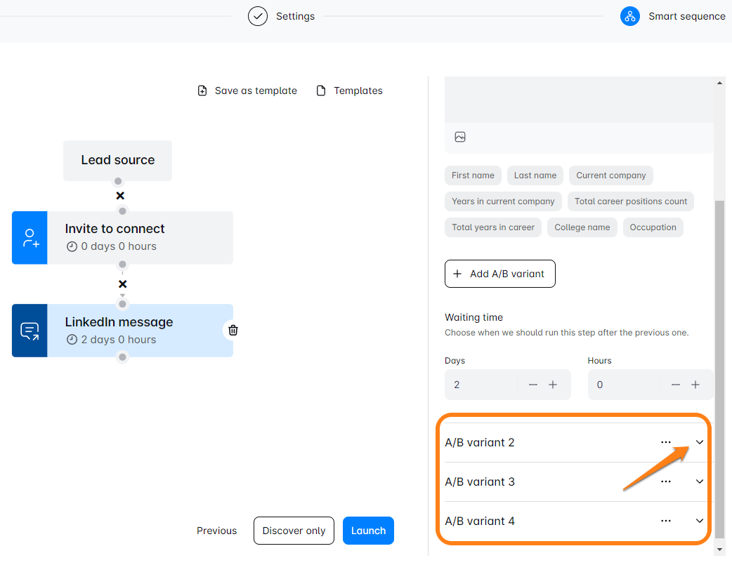 - En Skylead, puedes probar diferentes partes de tu mensaje, como mensajes de LinkedIn, correos electrónicos, InMails, invitaciones para conectar, o incluso el tiempo entre los pasos durante el proceso de creación de la secuencia de la campaña. ¡Puedes crear hasta 5 variantes de prueba diferentes!
