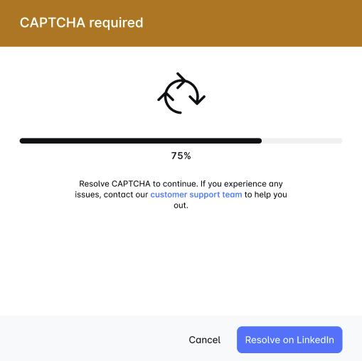 ¿Te encuentras con un CAPTCHA al configurar LinkedIn? 🧩 Simplemente haz clic en "Intenta por ti mismo", resuelve el rompecabezas e ingresa el PIN para completar la configuración. Si surgen problemas, nuestro equipo de soporte está aquí para ayudar. Estamos dedicados a hacer que tu experiencia con Skylead sea fluida. ¡Disfruta! 🚀