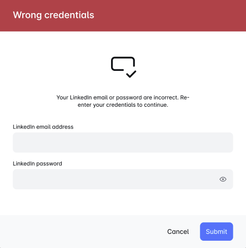 Rencontrez-vous un statut Mauvaises informations d'identification ? Cela signifie gĂ©nĂ©ralement que votre email ou mot de passe ne correspond pas Ă nos enregistrements. Cliquez sur le bouton rouge, saisissez Ă nouveau vos informations avec soin et soumettez. Si cela se produit pendant l'intĂ©gration, actualisez votre saisie d'identification. Pour une aide supplĂ©mentaire, le support Skylead est lĂ . Voici pour un accĂšs sans faille ! đâš