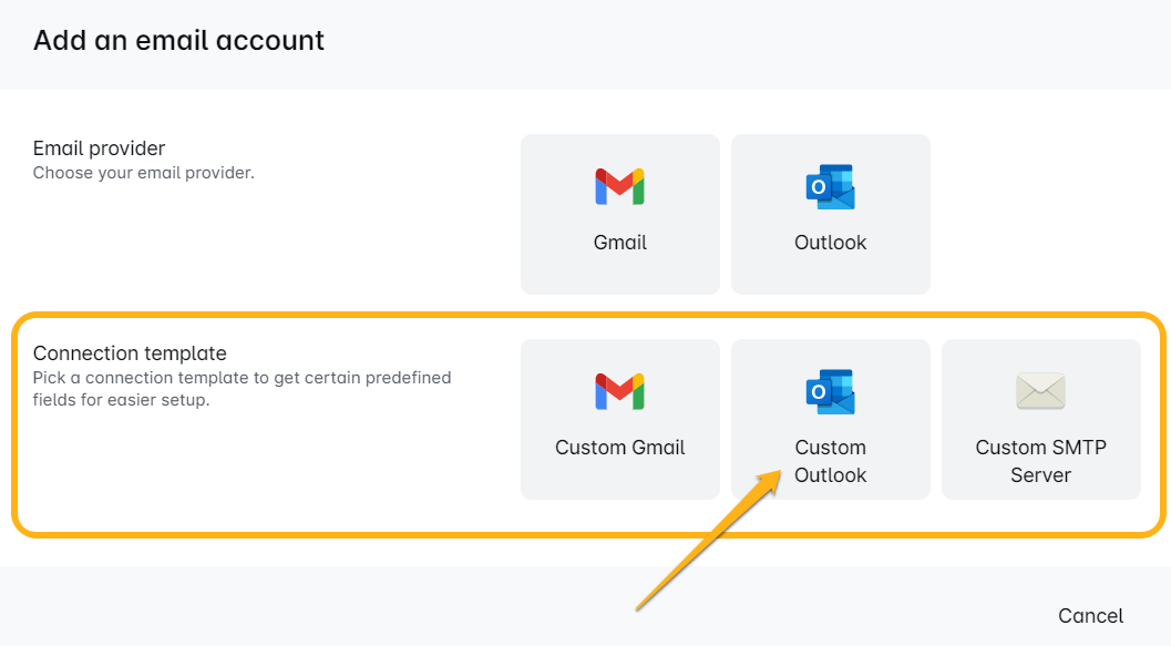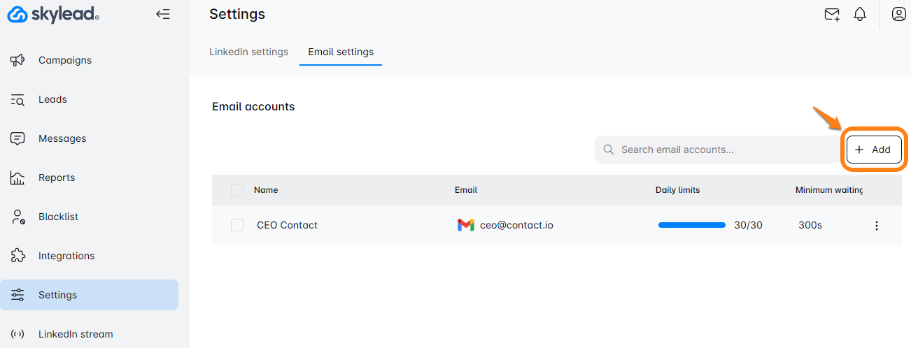 - Laten we nu teruggaan naar je Skylead-account. Ga naar Instellingen > E-mailinstellingen. Klik op de Toevoegen-knop en selecteer de Aangepaste Outlook-sjabloon.