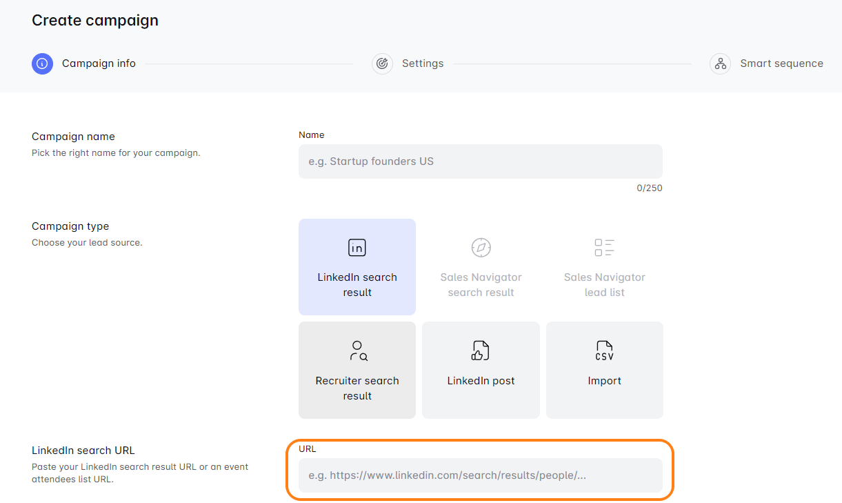 - Em seguida, basta copiar e colar a URL com seus novos Resultados de Pesquisa do LinkedIn. Alternativamente, você pode importar um arquivo CSV, Pesquisa do Sales Navigator, Lista de Leads, etc., na etapa “Informações da Campanha”.
